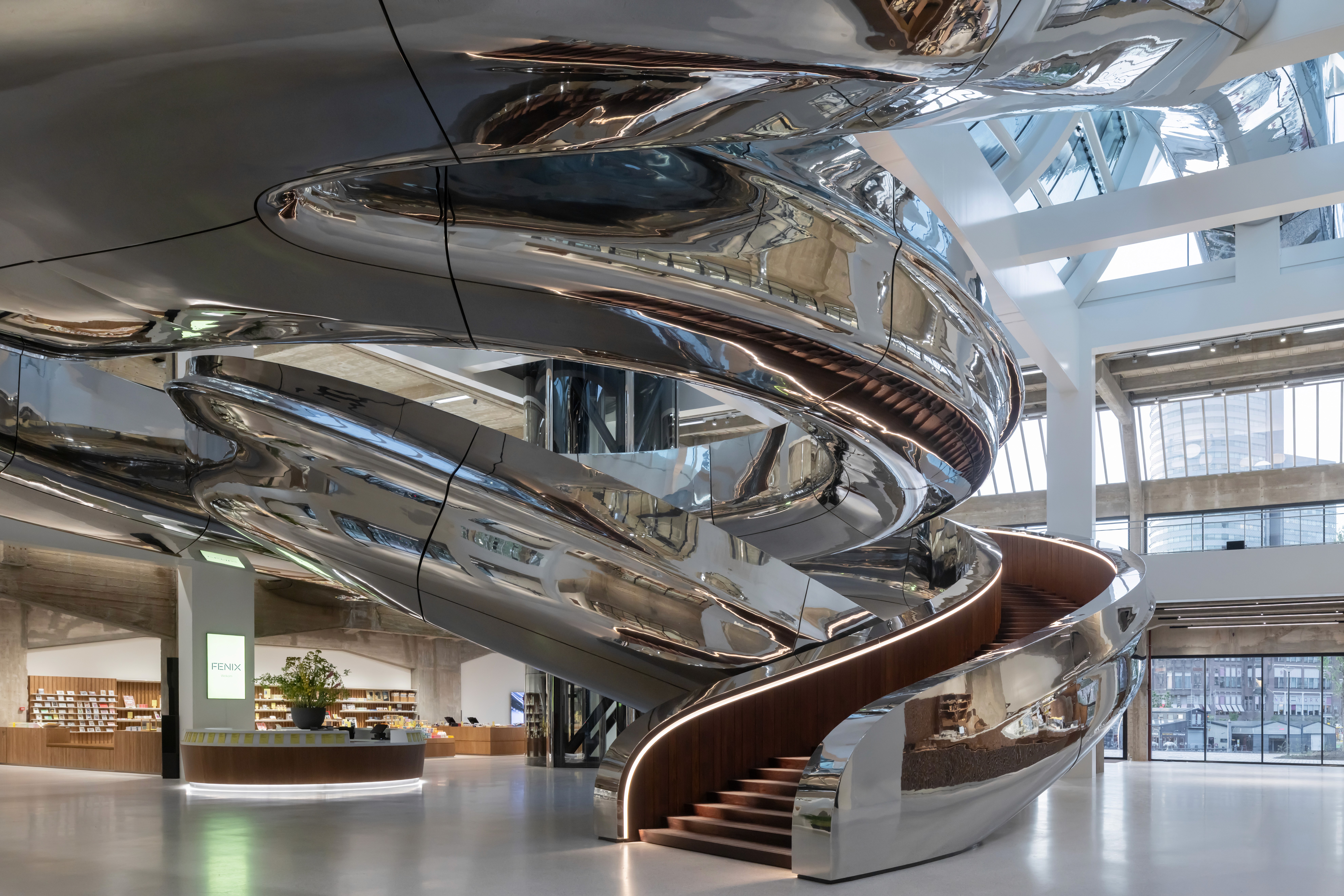 Binnen zie je kunst, foto’s en installaties over migratie van toen en nu. De blikvanger is de Tornado, een dubbel gedraaide trap die je naar een panoramadak brengt met uitzicht over de Maas en de skyline. Alleen daarvoor wil je al naar boven.